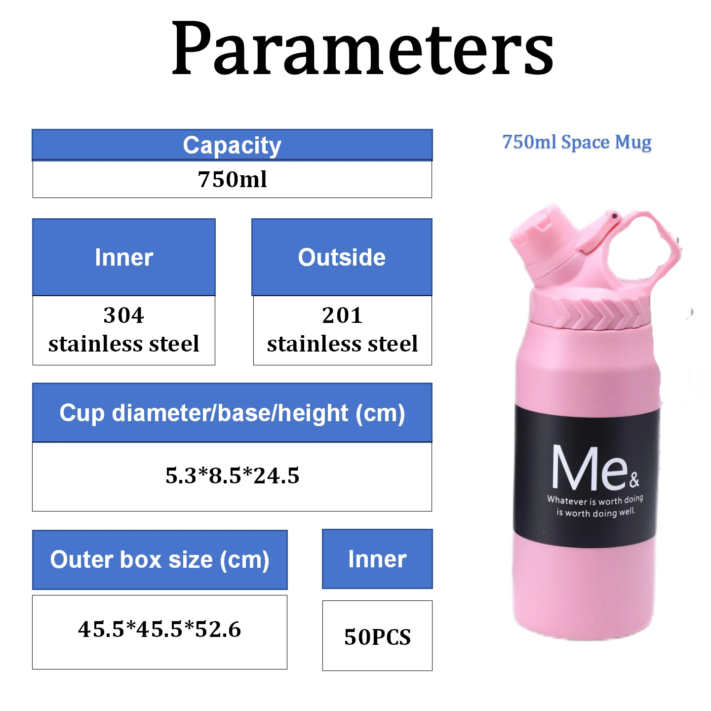 750ml Large Capacity Stainless Steel Vacuum Cup Portable Handle Sports Water Bottle for Gym Camping Direct Drinking Applicable