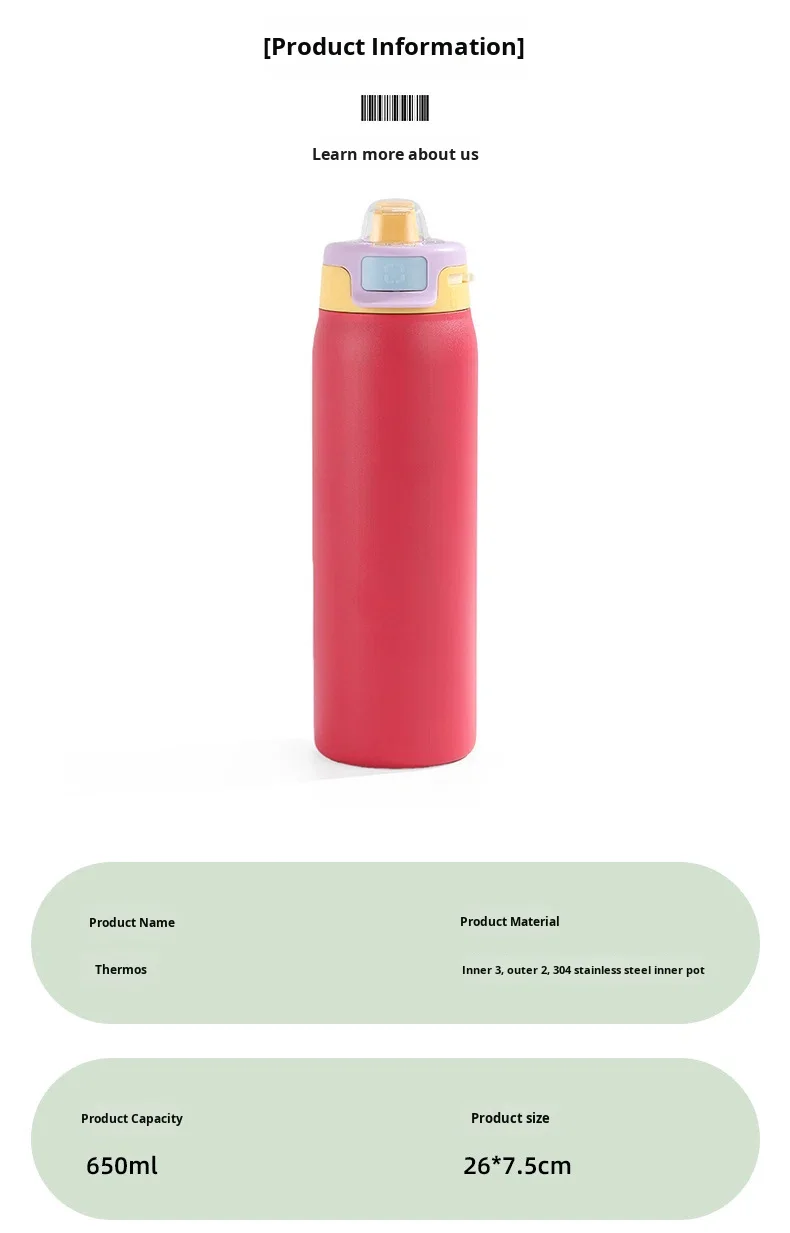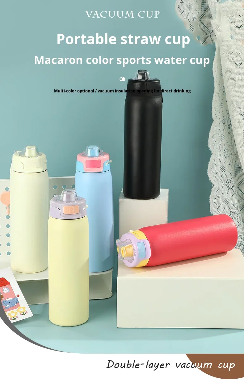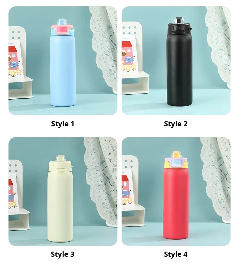 Custom Modern Stainless Steel Button Water Bottle with Straw 650ml Large Capacity Travel Vacuum Insulated Beverage Bottle